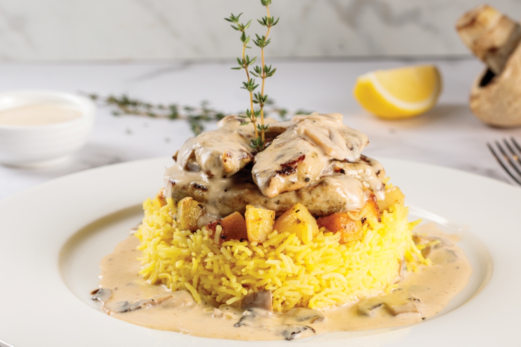 Roasted chicken with baked potato, pumpkin, drizzled with mushroom sauce layered with saffron rice.
