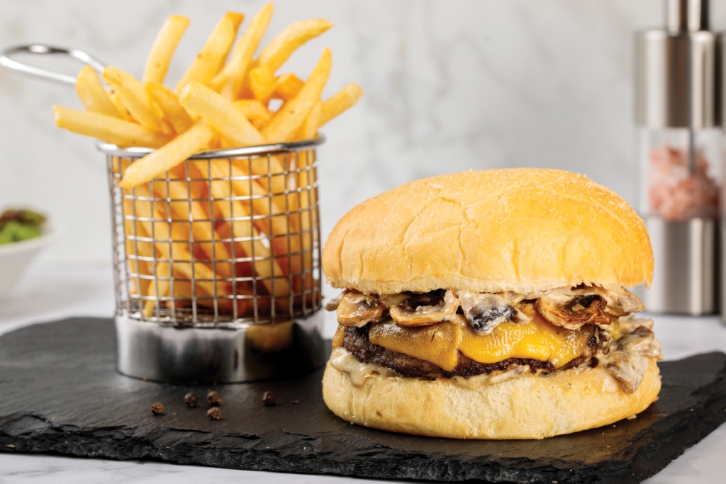 Beef patty, mature cheddar cheese, sauteed mushroom slices,mushroom sauce, salad & fries on the side.