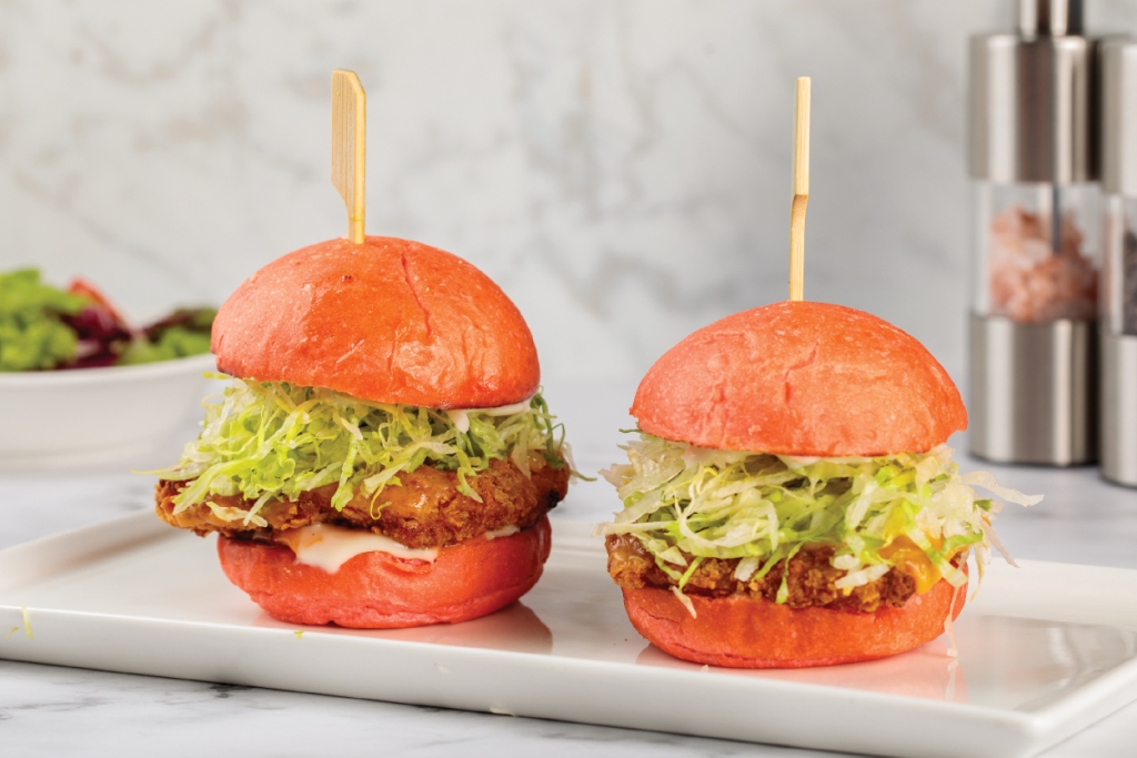 Breaded chicken garnished with fresh vegetables & special sauce.