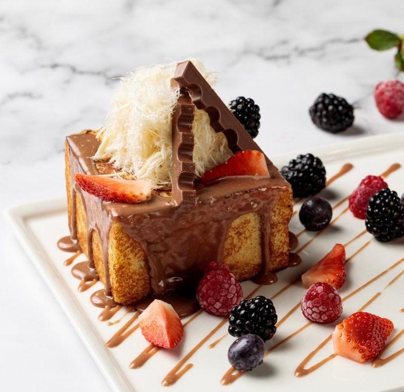 French toast bread, stuffed with kinder sauce, served with strawberry, blueberry, blackberry, kinder chocolate, cotton candy and ice cream on the side.