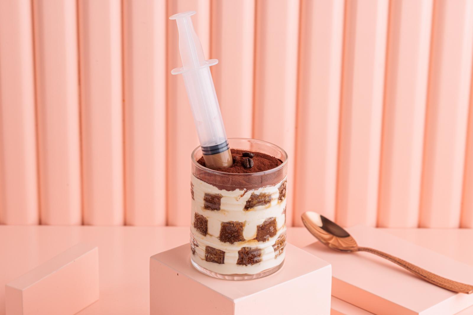 Cup of layered chocolate sponge and chocolate mousse top with chocolate flakes.