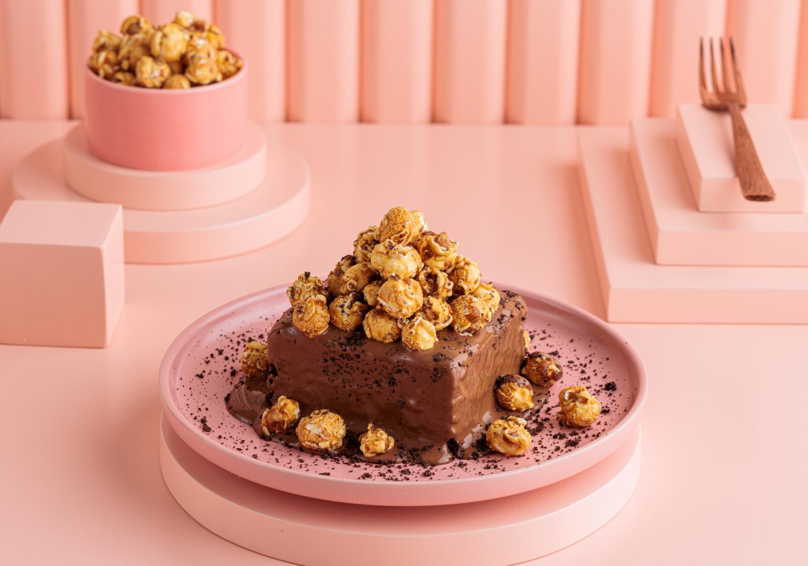 Dark chocolate fudge cake filled with popcorn sauce, covered with milk chocolate and topped with crunchy caramelized popcorn and crushed oreo.