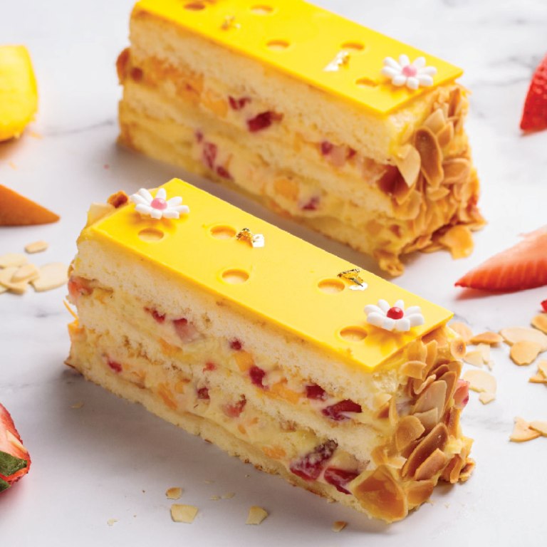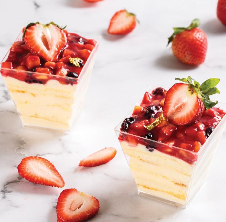 A layer of vanilla and fruity cream top with glazed fresh fruits. Minimum order of 2 slices.