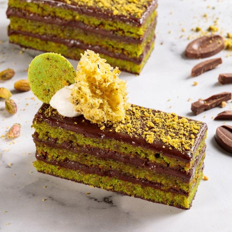 Pistachio sponge with nutella thick cream. Minimum order of 2 slices.