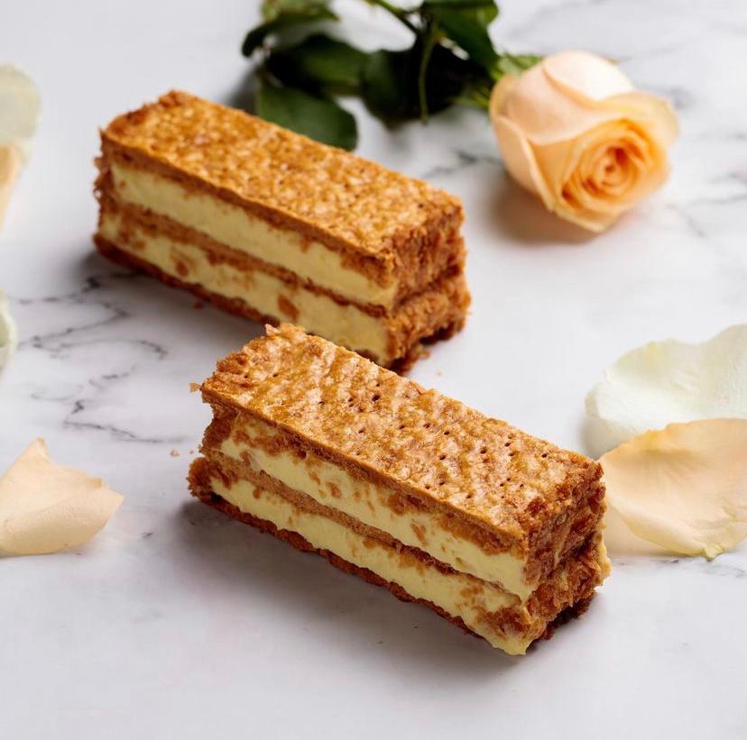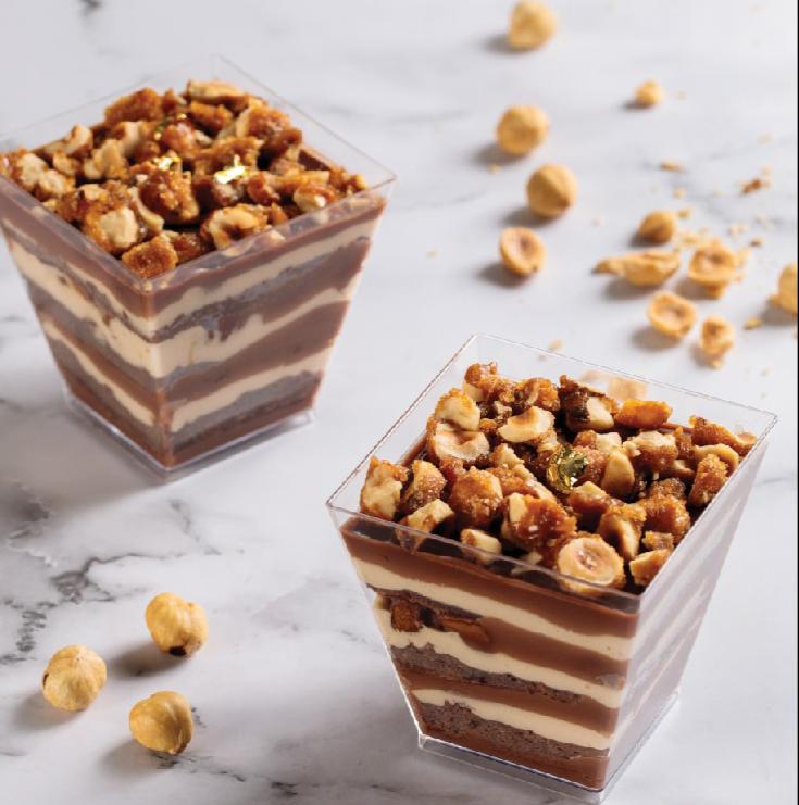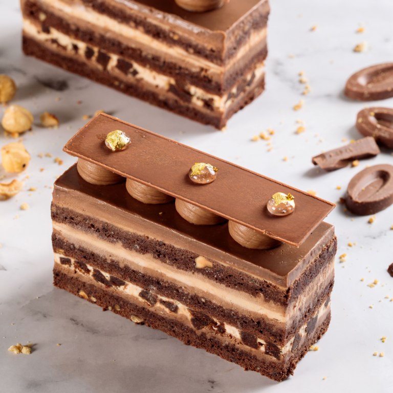 Hazelnut sponge, praline mousse, gianduja milk ganache, hazelnut crispy and milk sponge. Minimum order of 2 slices.