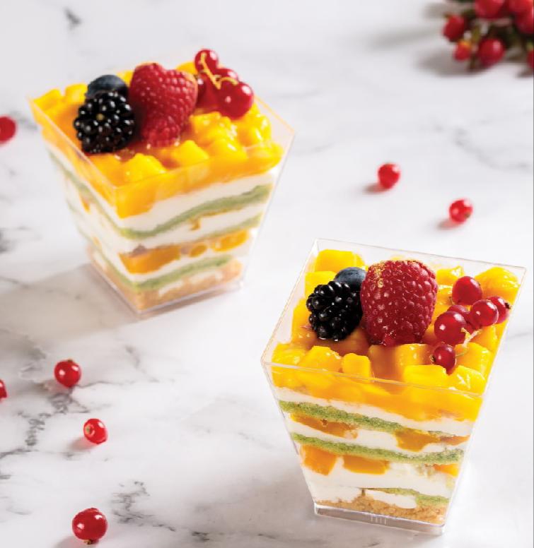 Cup of digestive biscuit base filled with pistachio sponge, fresh mango and vanilla mousse.