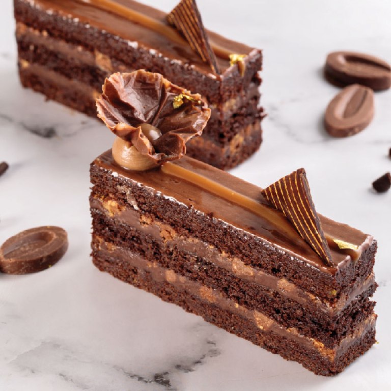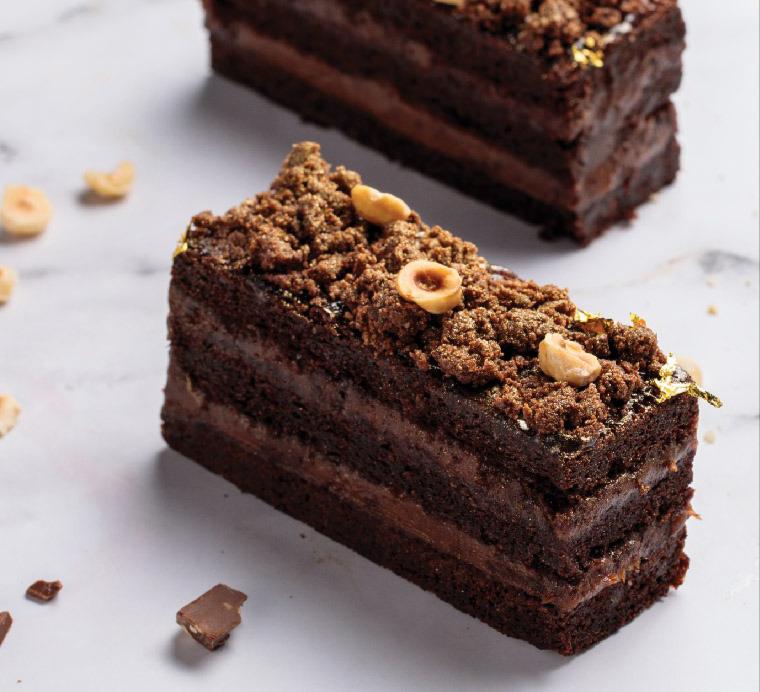 Moist sponge chocolate, nutella mix with hazelnut praline crispy. Minimum order of 2 slices.