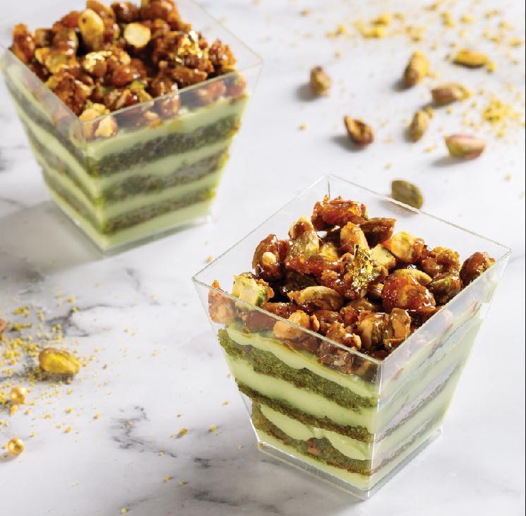 Cup of pistachio layered cake with caramel and pistachio creme brulee.