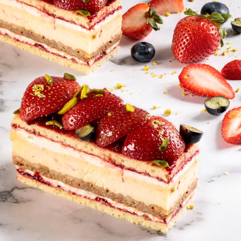Creamy layer of cheesecake, strawberry jam, vanilla sponge and ginger biscuit. Minimum order of 2 slices.
