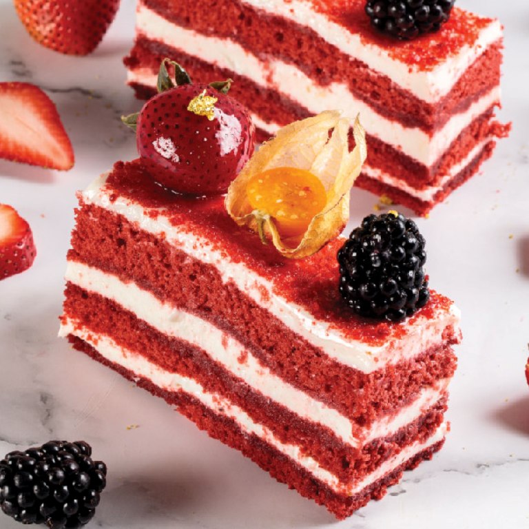 Red velvet sponge cake with cream cheese mousse. Minimum order of 2 slices.
