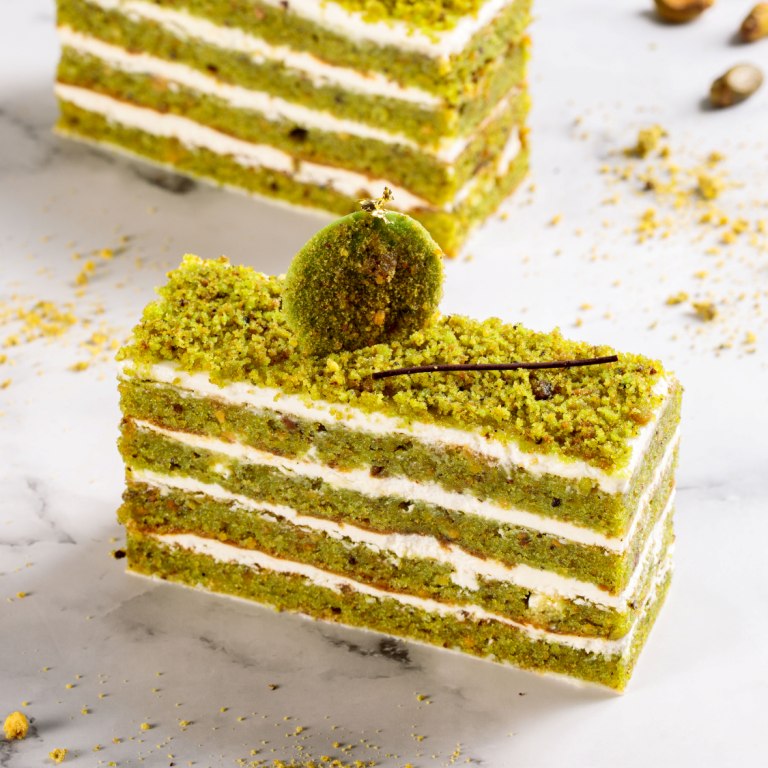 Pistachio sponge with thick cream. Minimum order of 2 slices.