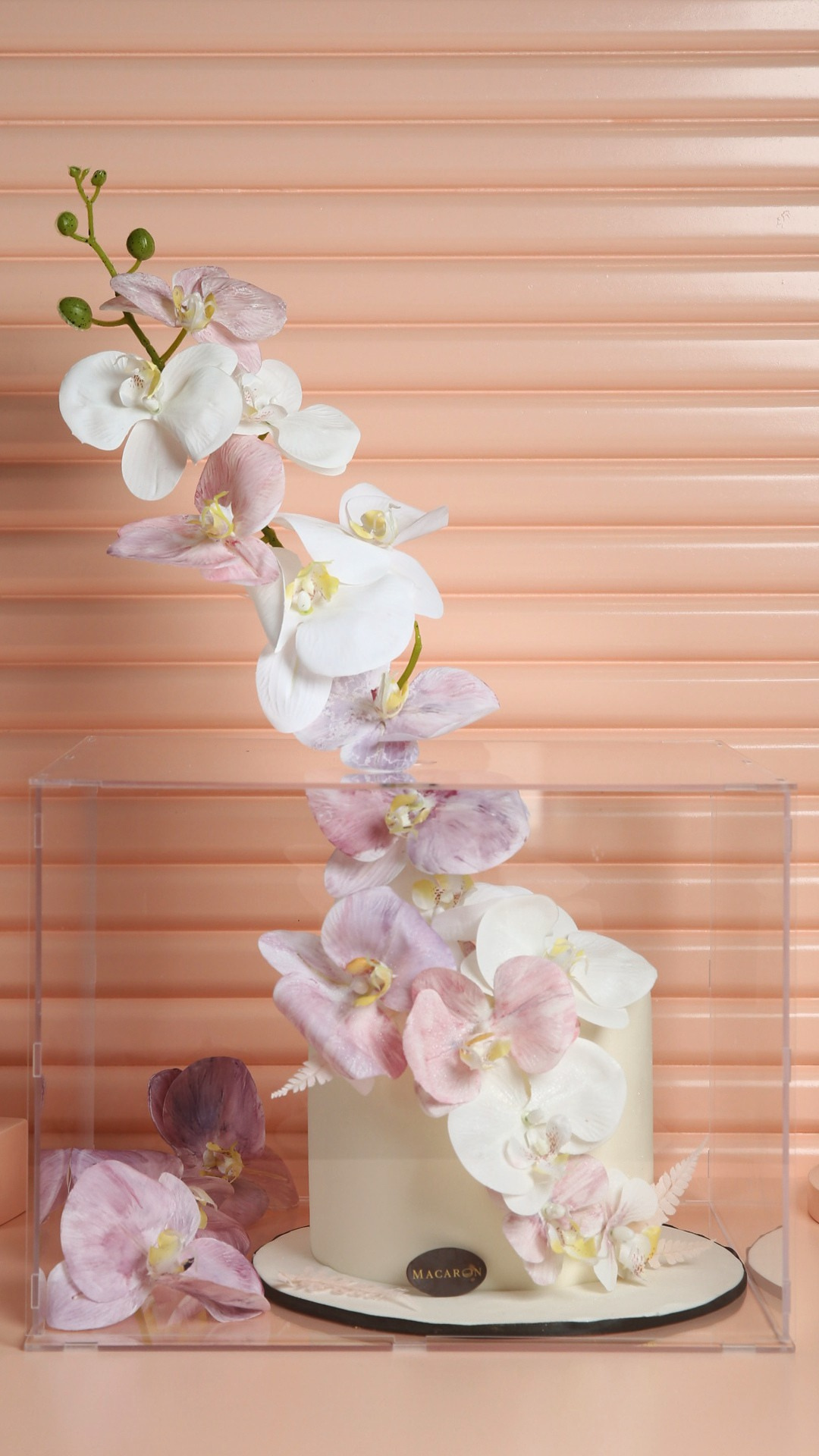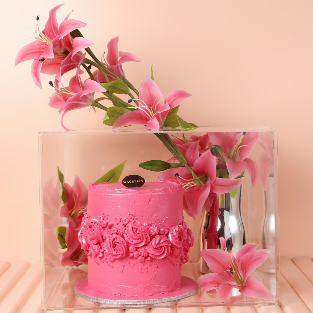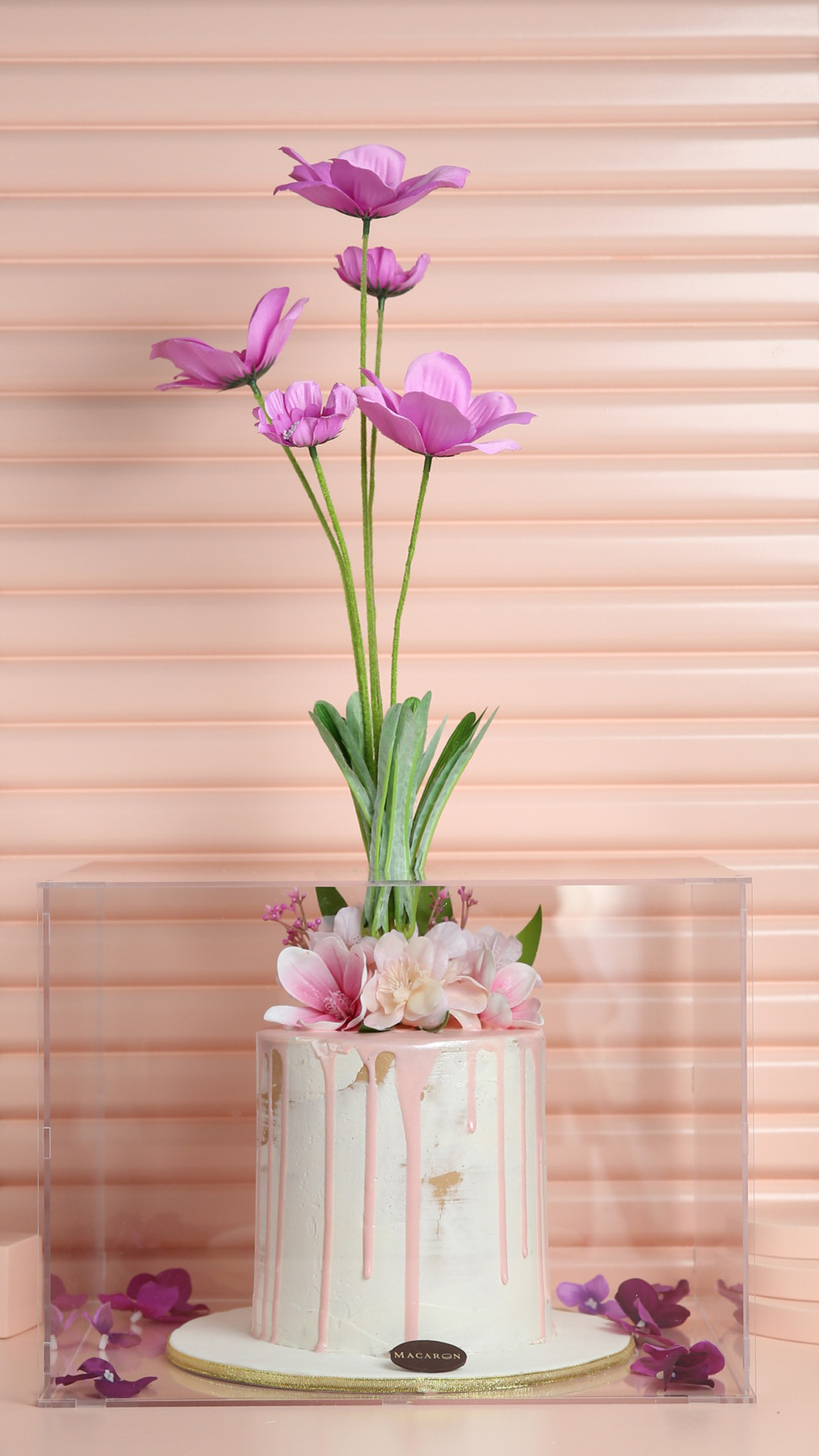 1.5 KG Cake with regular flavors and decorated flowers in a base in acrylic box starting from BD43