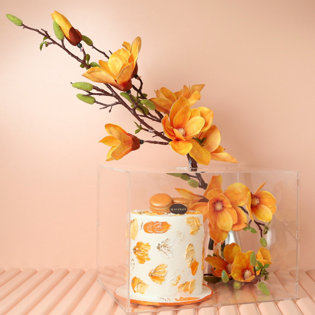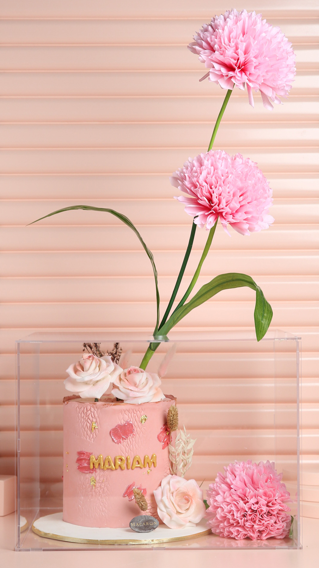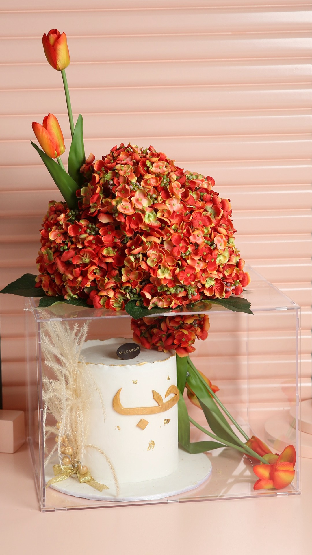 GIFT CAKE with FLOWERS in ACRYLIC BOX