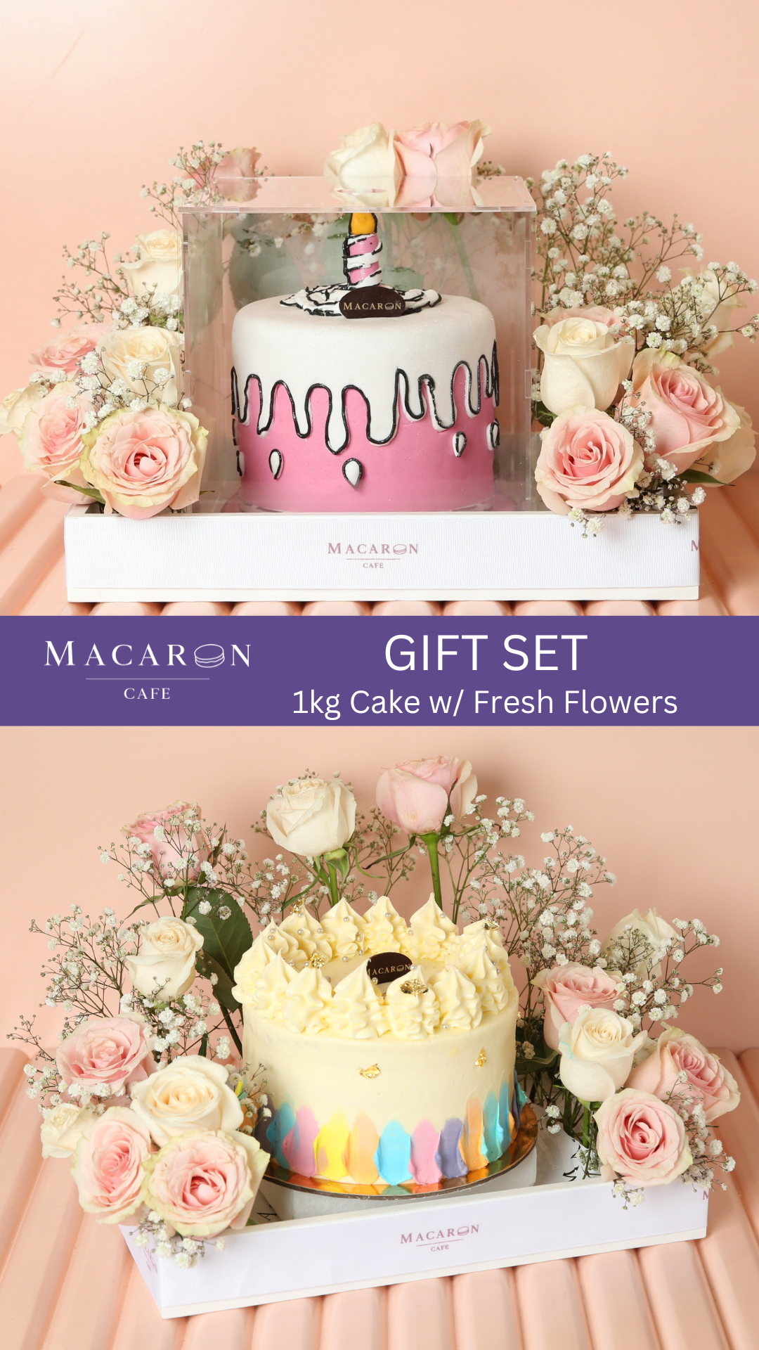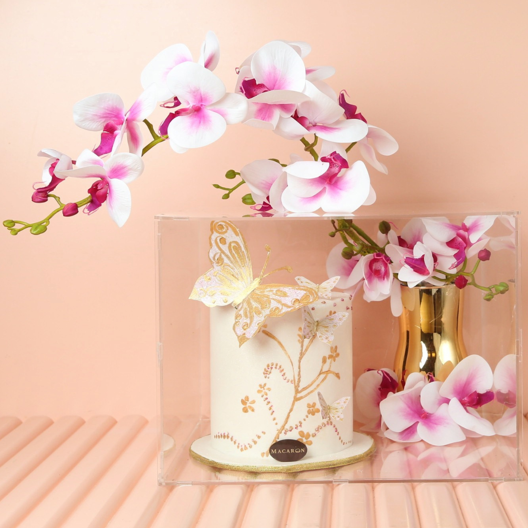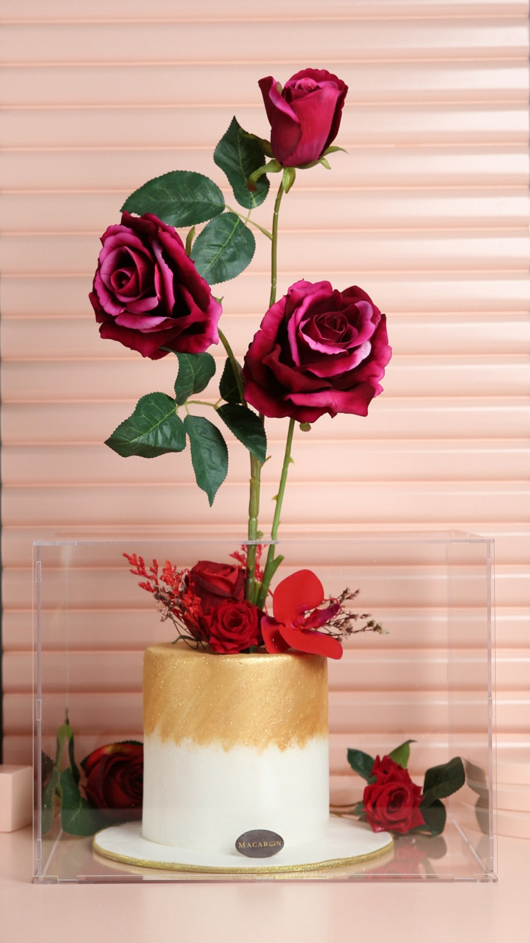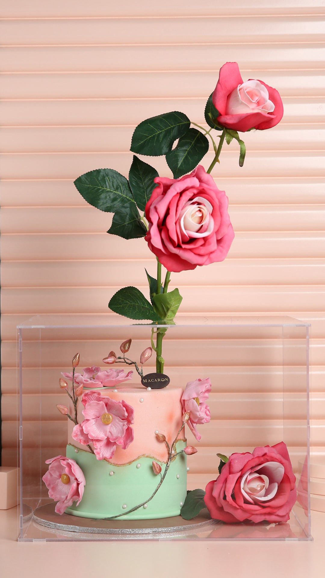 GIFT CAKE with FLOWERS & BASE in ACRYLIC BOX