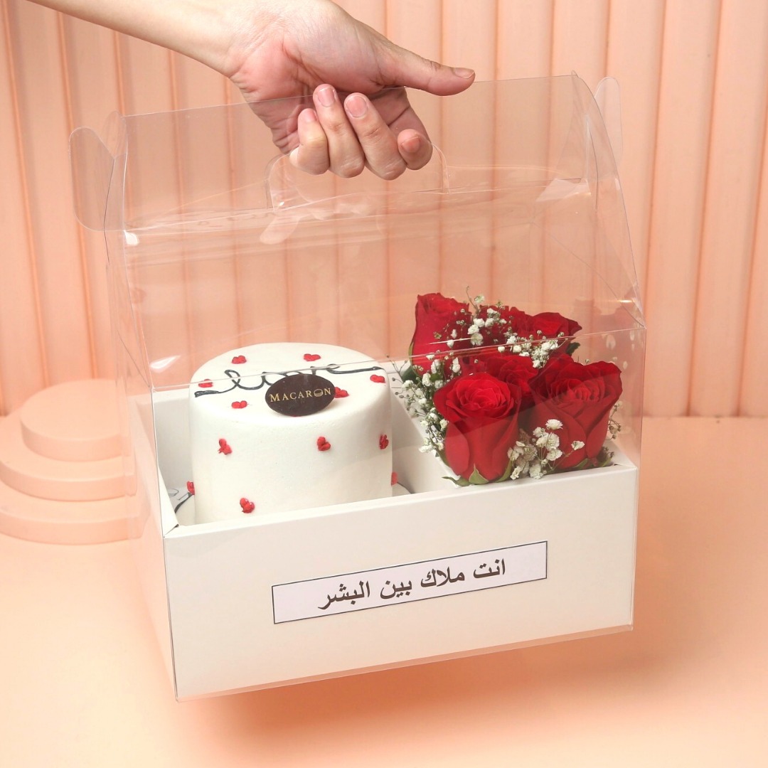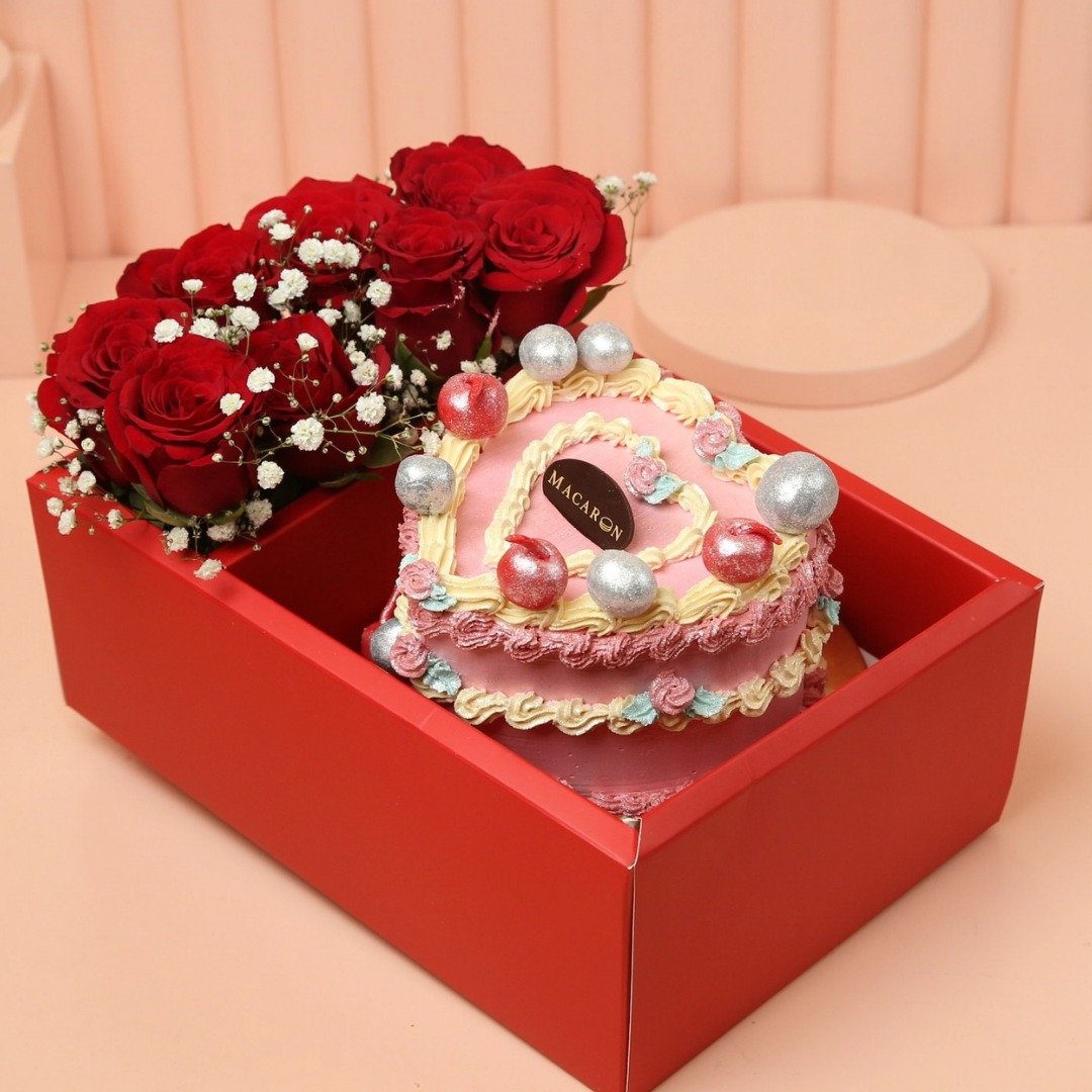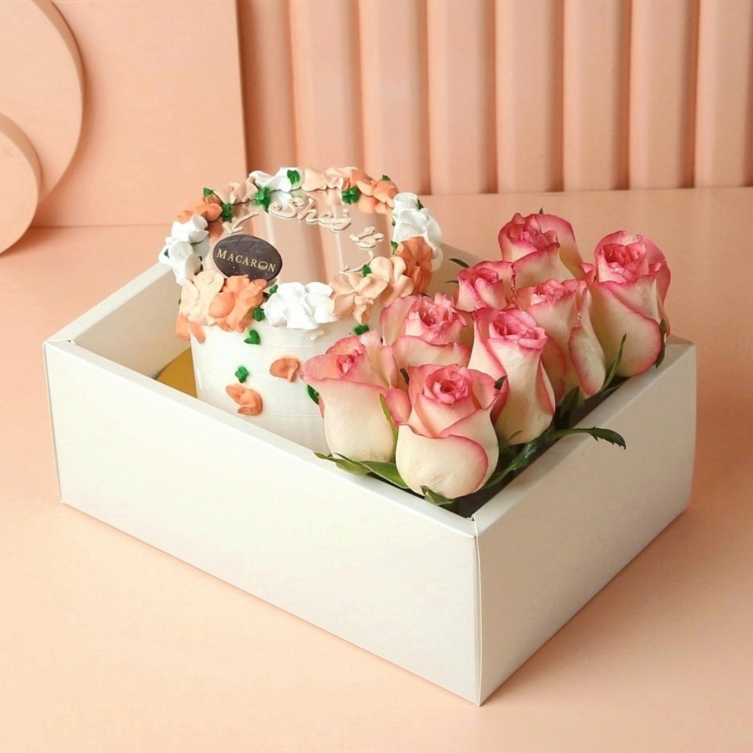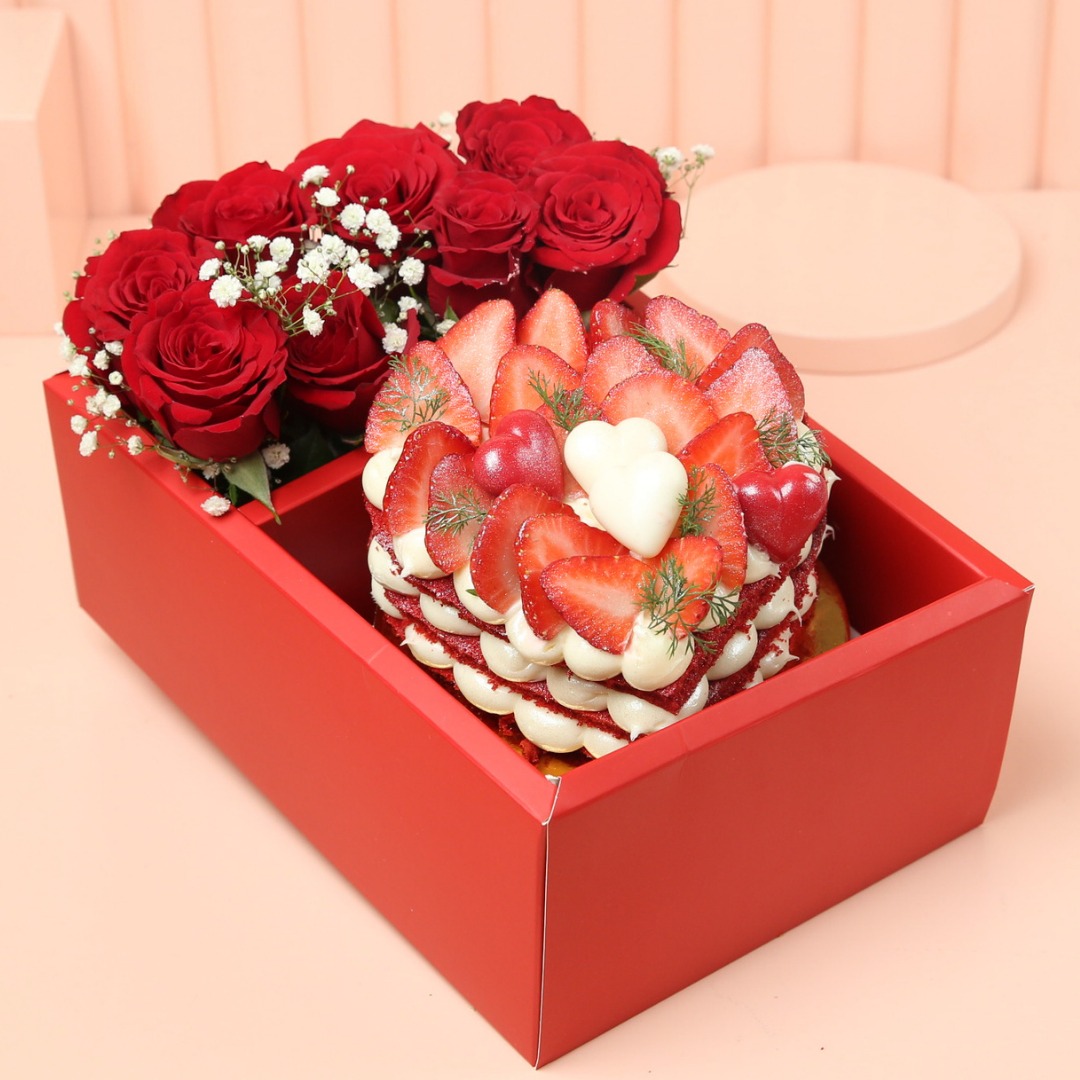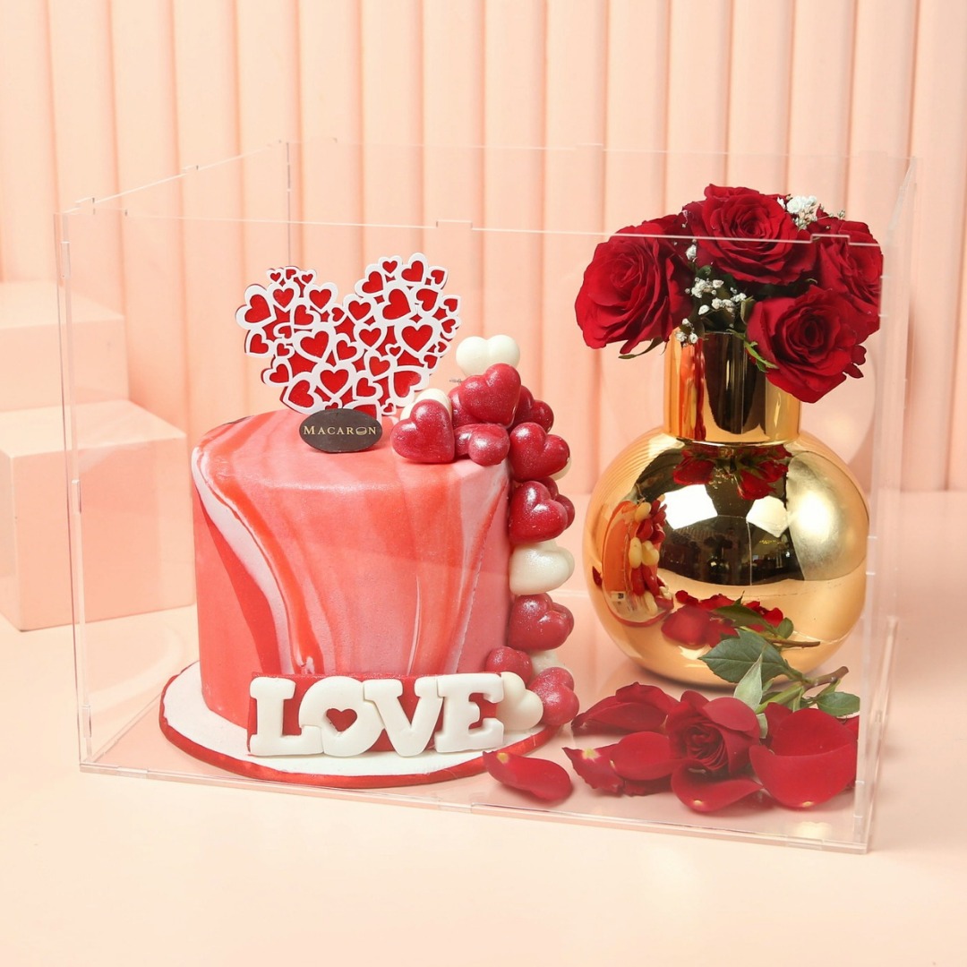 1KG cake with your choice of flavor, Fresh Roses in a flower vase and presented with acrylic gift box.